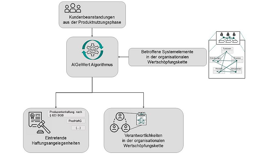 Aufbauend auf den DFG Projekten „KAUSAL“, „ReMaiN“ und „FusLa“ setzt sich AlGeWert zum Ziel, eine robuste Rückverfolgbarkeit und Gewährleistung der Handlungssicherheit in den organisationalen Strukturen der Wertschöpfungskette von Unternehmen durch die Heranziehung von haftungsrelevanten Kundenbeanstandungen aus der Nutzungsphase zu erzielen. Dies soll durch die Entwicklung eines Algorithmus geschehen, der haftungsrelevante Anforderungen und Fehlerdefinitionen mit einem Organisationsmodell zur Darstellung von organisationalen Wertschöpfungsketten koppelt, um durch die Handhabbarmachung von Komplexität eine verbesserte Rückverfolgbarkeit und Handlungssicherheit zu gewährleisten.